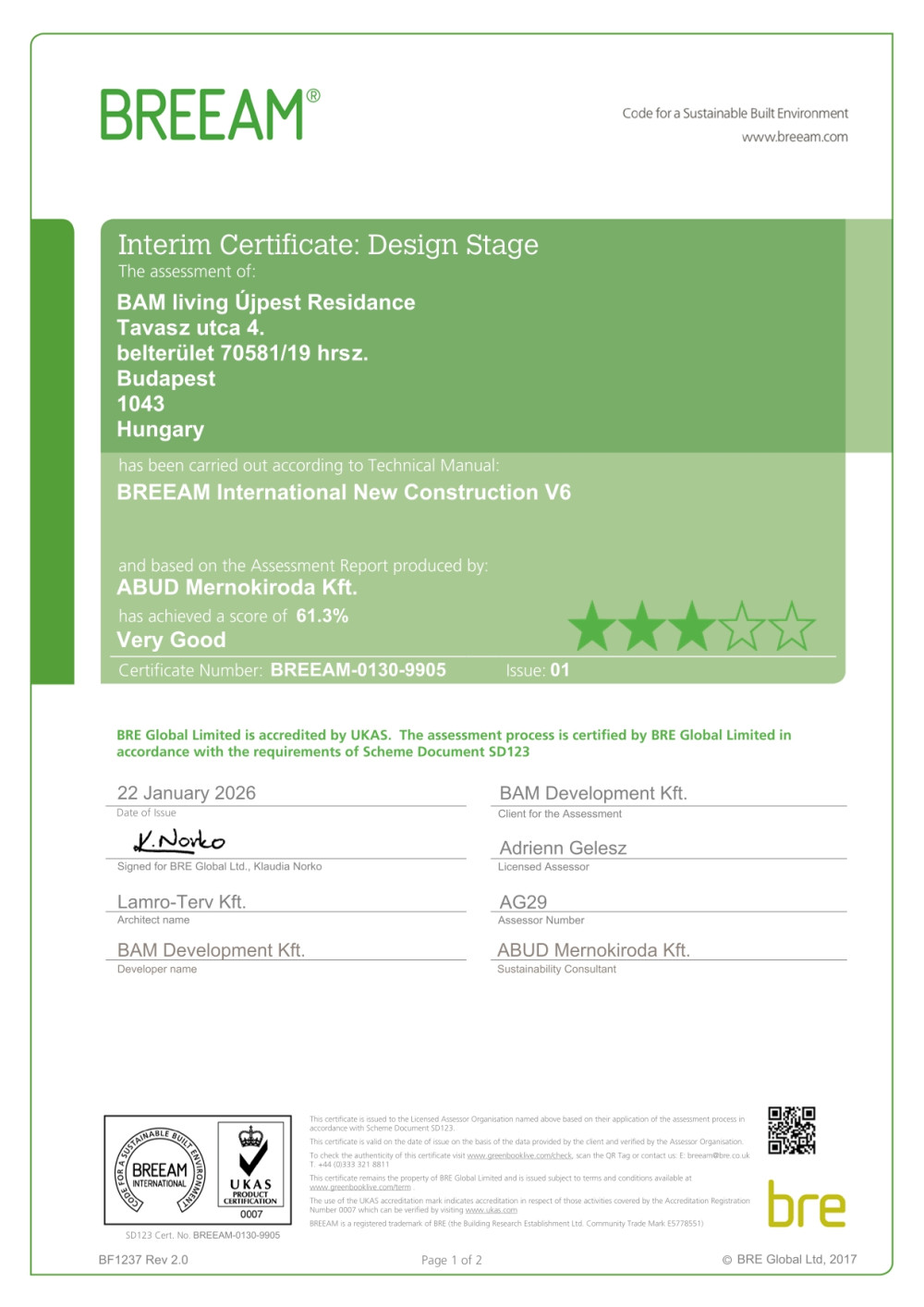 A BAM Living Újpest Residence projekt sikeresen megszerezte a BREEAM International New Construction v6 rendszer szerinti Very Good minősítést a design stage szakaszban. Ez az eredmény több szempontból is kiemelkedő. Azon túl, hogy nagyon fontos szakmai visszaigazolás a munkánkról, ez az első Magyarországon lakóépületre kiadott BREEAM v6 minősítés, ami valódi mérföldkőnek számít a hazai ingatlanfejlesztések történetében.
