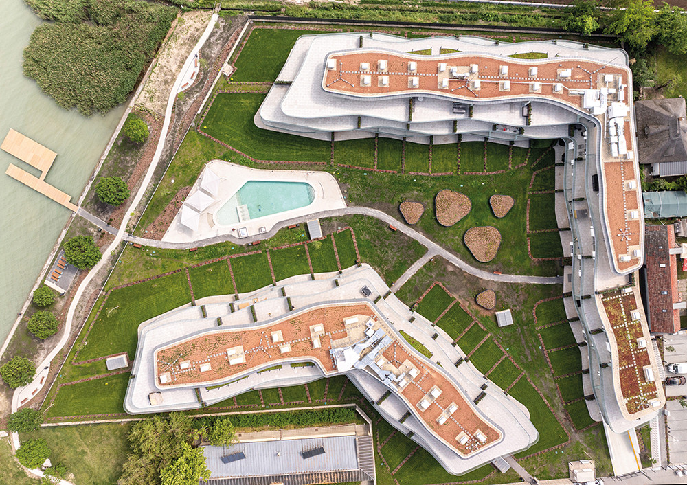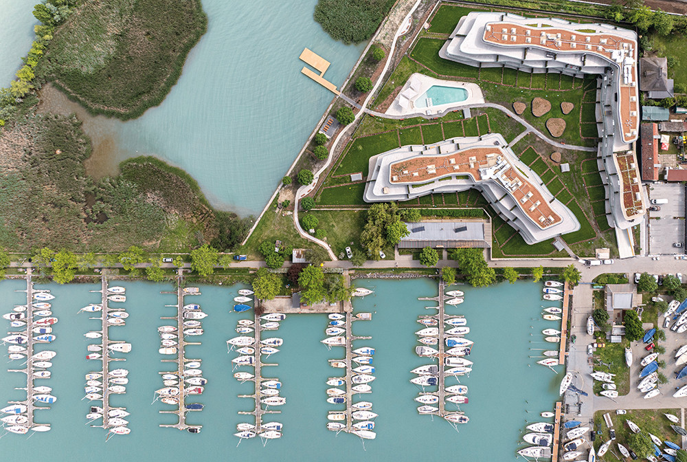 • A Szemesbay Resort építészeti koncepcióját a hullámok és a vízpart tematikája határozta meg. A hullámforma vizuális szépsége, játékossága és harmóniája egyedülálló és modern megjelenést kölcsönöz a fejlesztésnek, miközben az épülettömegnek könnyed és elegáns jelleget ad.