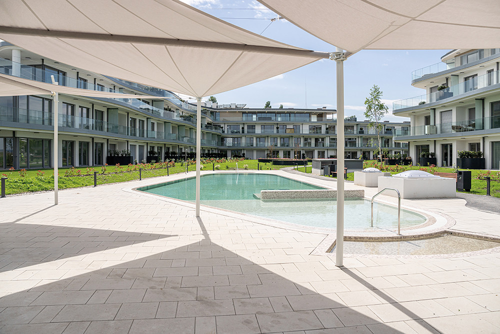 • Az épületeket összekötő belső kertben és a medence környékén helyi biodiverz fa-, bokor- és virágfajokat ültettünk, amelyek egész évben szemet gyönyörködtető összhangot alkotnak.