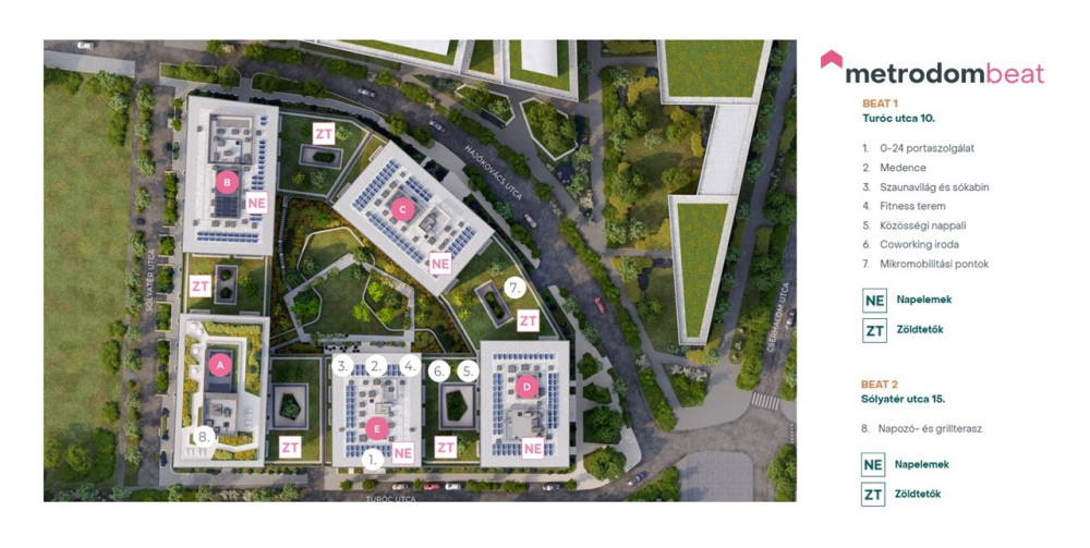 A Metrodom Beat a modern kor emberének igényeire hangolt prémium szolgáltatásokkal és élhető alaprajzú, magas műszaki és minőségi tartalmú exkluzív lakásokkal kialakított lakóépület együttes. Előremutató energiahatékony és környezettudatos zöld szellemiségű megoldásaival méltó mintául szolgál a jövő lakóépületeinek, ahova mindig jó lesz hazatérni.